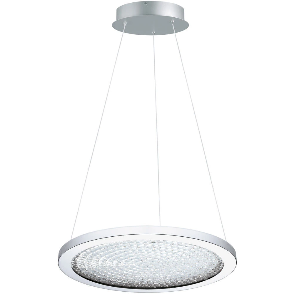 The Arrezo 3, LED Pendant by Eglo features a luxurious material in an unexpected place. The chrome finish with a clear cover that hosts numerous crystals that the illumination graces with an air of sophistication. Great for any space in your home area where a little dash of high end detail can transform the entire space.