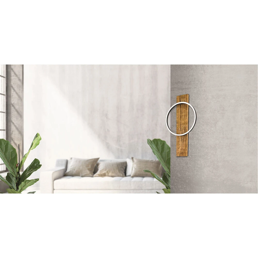 The Boyal LED wall light by Eglo has a rustic yet refined appearance. This wall light features a brushed pine wood finish. Its integrated LED light source emanates from the single black circular ring creating a look thatโs both rustic and modern