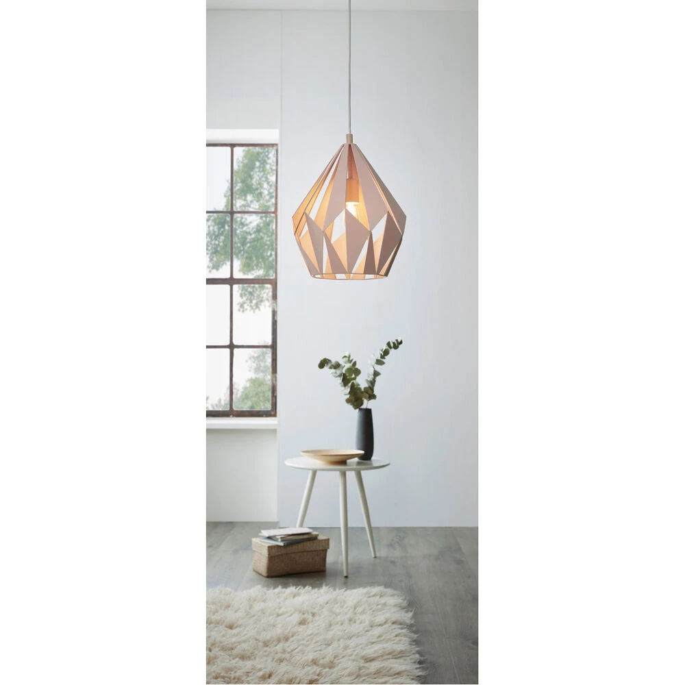 Eglo’s Carlton-P Pendant is ornamental in style. This 1-light pendant features a apricot-finished geometric shade . The artistic elongated design lends it a vintage appearance and ambient feel that will surely rub off on the interior decor of the room.