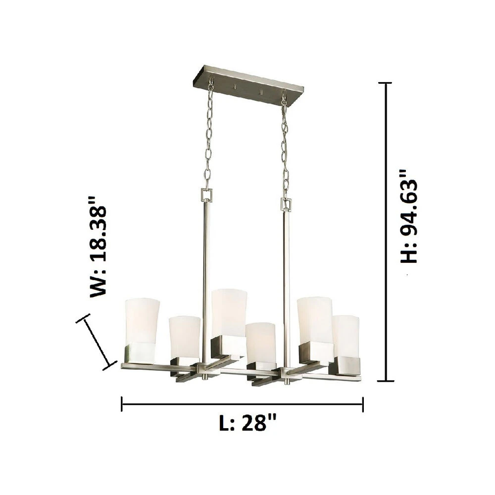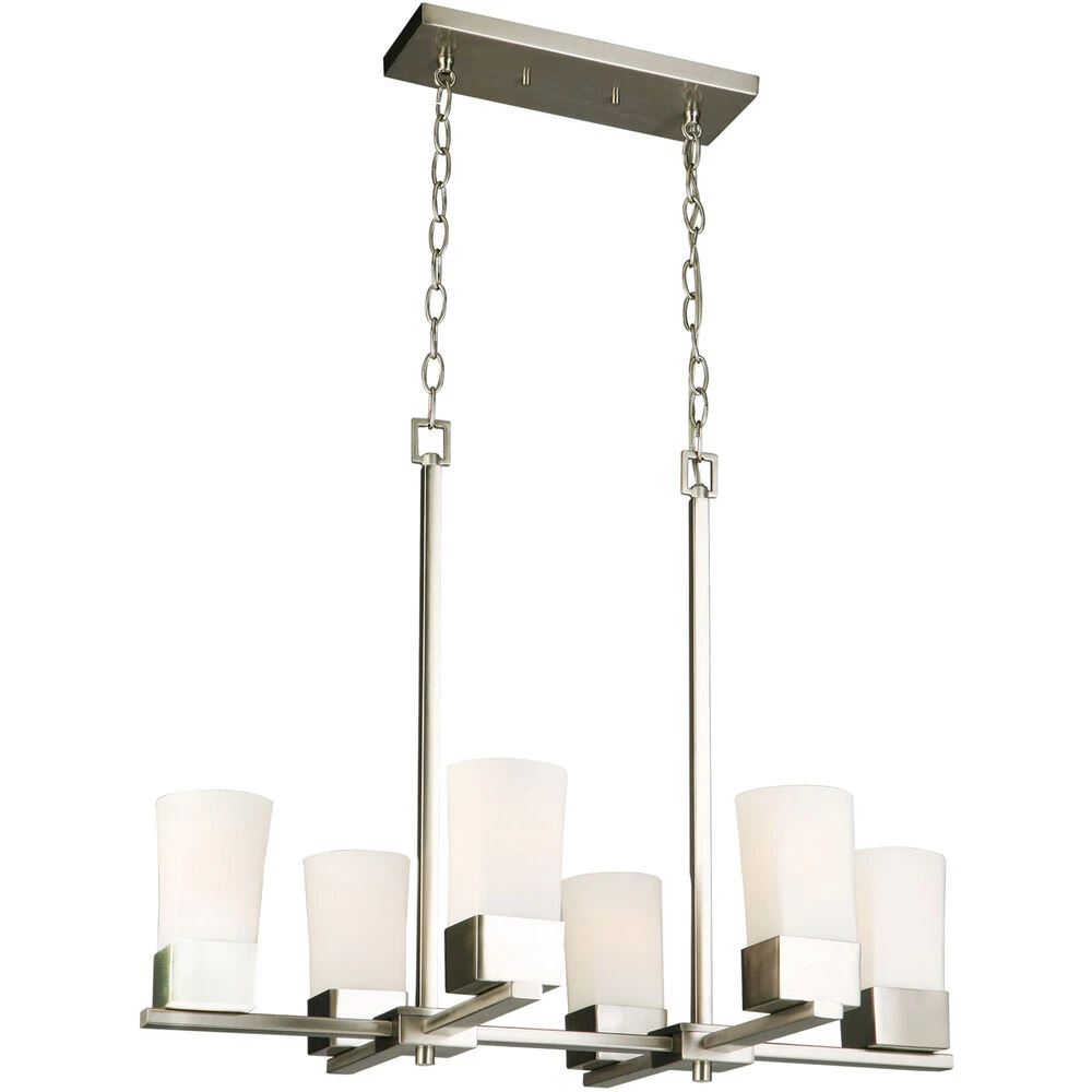Light up your living space with the Ciara Springs Chandelier by Eglo. This linear chandelier features six frosted white cube shaped glass atop its rectangle metal framework with a brushed nickel finish to provide an appealing contrast to any home dรฉcor