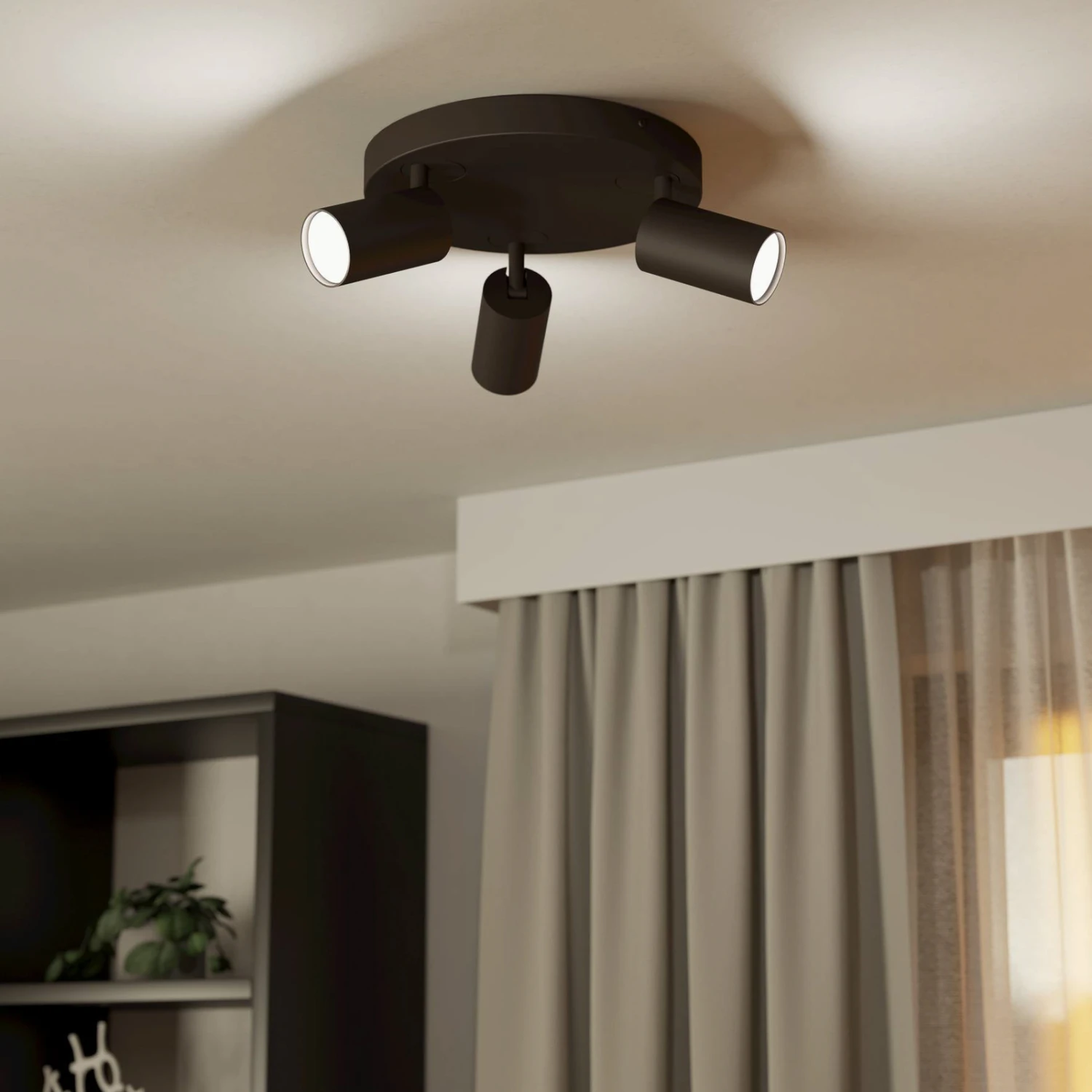 Three-lamp Telimbela-Z LED ceiling spot, smart controllableThe round Telimbela LED ceiling spot made of steel, equipped with three movable spotlights, is supplied including smart controllable light sources. These offer both coloured light from a variety of RGB light colours and white light that can be adjusted in the range from warm white (2,700 K) to daylight (6,500 K). All settings can be adjusted via the AwoX Home Control app, which is available free of charge for Android and iOS. The control of the luminaire via Bluetooth as well as ZigBee 3.0 also enables the control via compatible voice assistants and the integration of the luminaire into compatible smart home systems.A further control option is offered by the remote control available as an accessory.features / compatibility:- controllable with the free AwoX HomeControl app – compatible with smart home systems from other manufacturers that use ZigBee 3.0- direct connection with Amazon Echo and Google Home possible- increased range through additional Bluetooth Mesh- controllable with matching remote control even without internet access (see accessories)