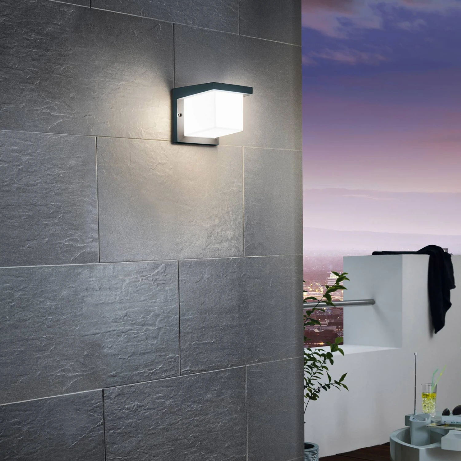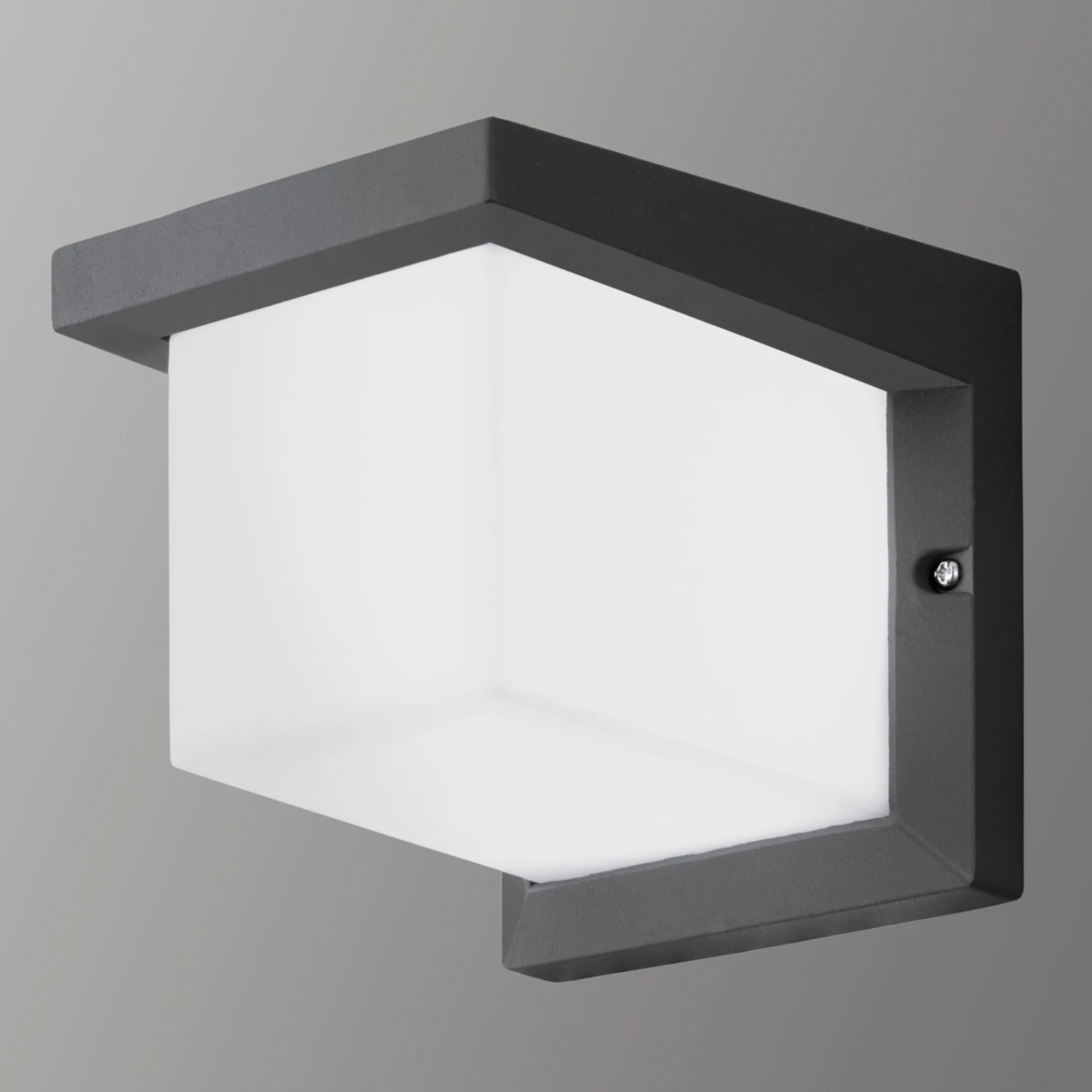 Energy-efficient and durable LEDs have been integrated in the cube-shaped plastic lamp body of the Desella outdoor wall light with warm white LED light that gives you bright and pleasant lighting conditions around your house. The satin white square shade is only surrounded from the top and from the wall by the anthracite grey die-cast aluminium housing from which the light can exit evenly on all sides to illuminate the surrounding area.