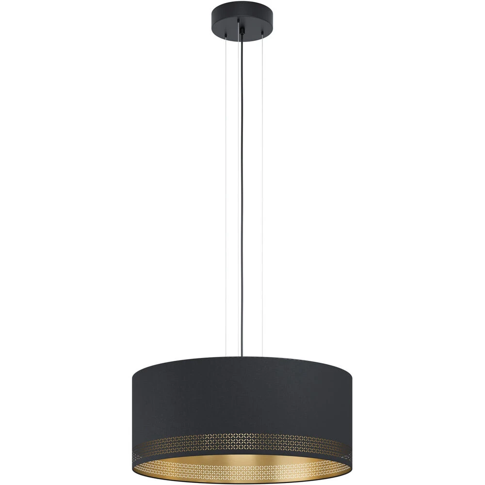 The Esteperra three light hanging pendant features a circular ceiling plate in a black finish, holding a drum shaped, black decorative fabric shade with gold lining. This stunning design will be a striking display for modern or contemporary decors. The pendant also features a gold design around the black exterior of the shade. The black hanging cord is fully adjustable for various hanging positions.