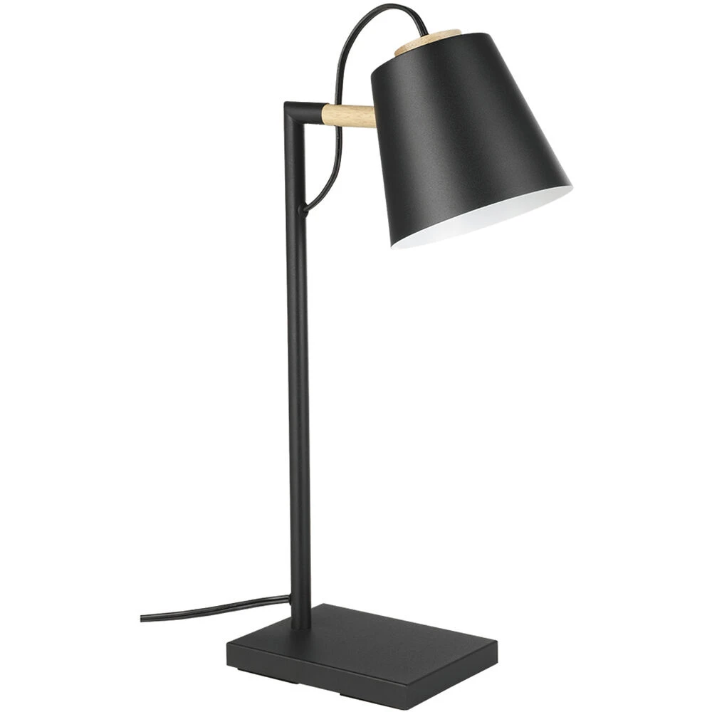 The Lacey table lamp by Eglo features a structured black finish w/ a natural wood accent. The metal shade is adjustable and has a structured black exterior and white interior finish. The black plug in cord measures 59″ long