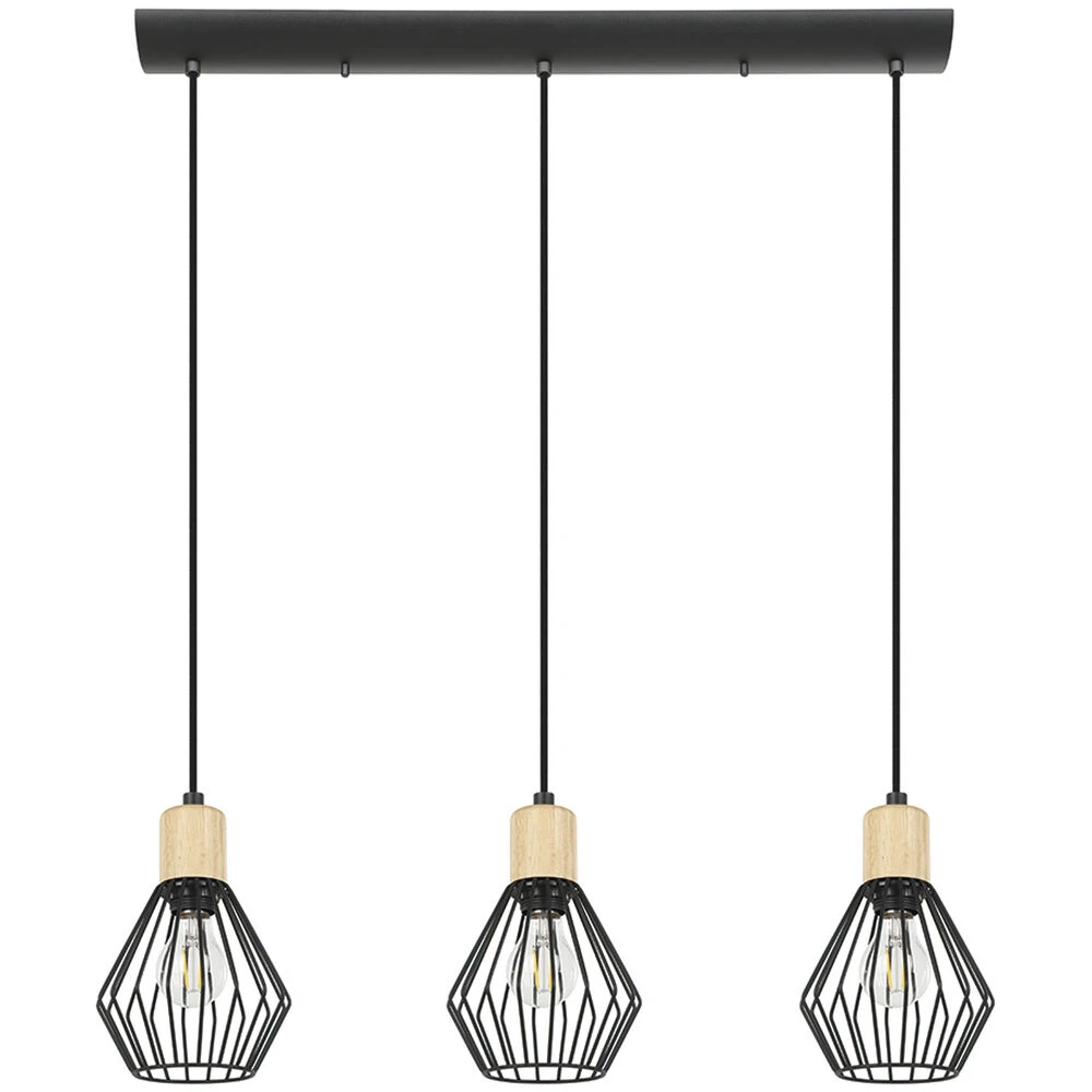 The Pamorla 3 light Island Pendant by Eglo features three geometric open frame metals shades accented with natural wood. The shades hang from black textile cables that are fully adjustable for various hanging heights