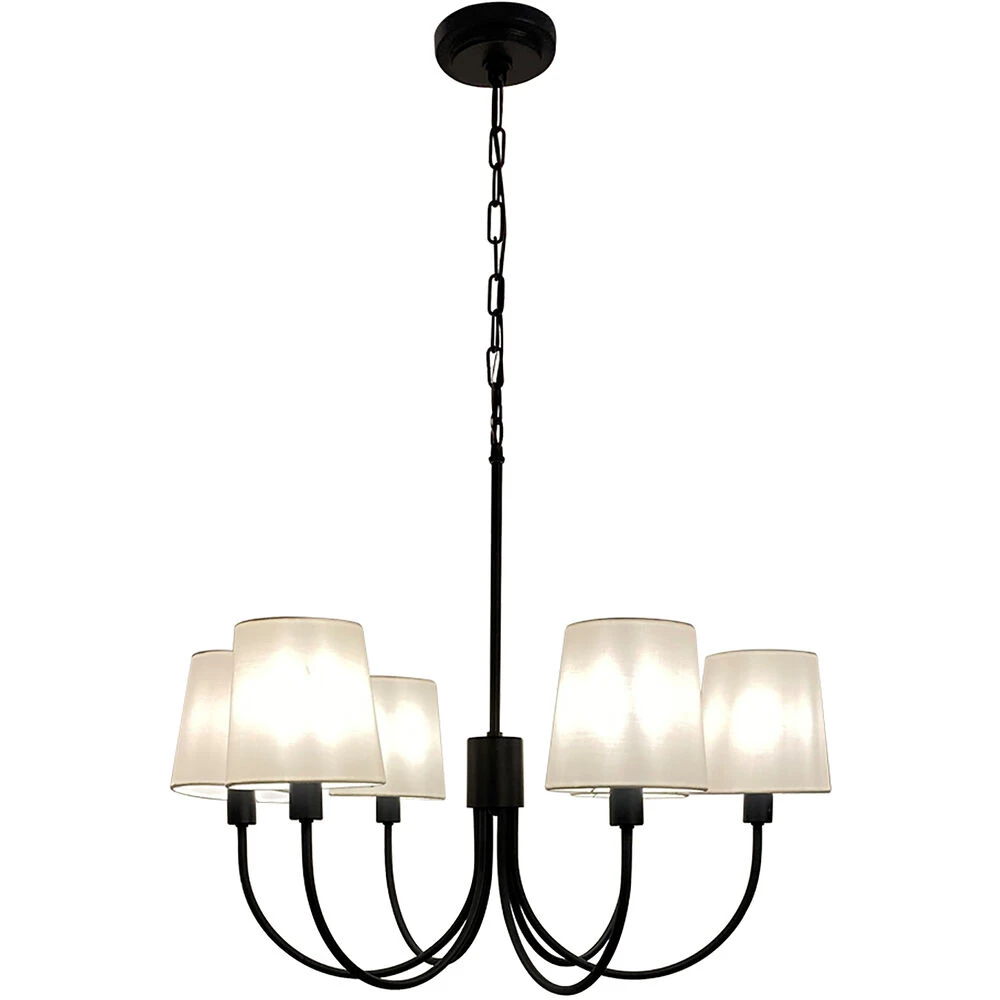 The SMYRNA chandelier offers a matte black finish with 6 rounded arms and 6 fabric cream shades that are removable making the choice yours whether to use shades or not. It hangs from a rod attached to chain allowing for adjustable hanging height. The simple and elegant design will fit flawlessly with your decor design.