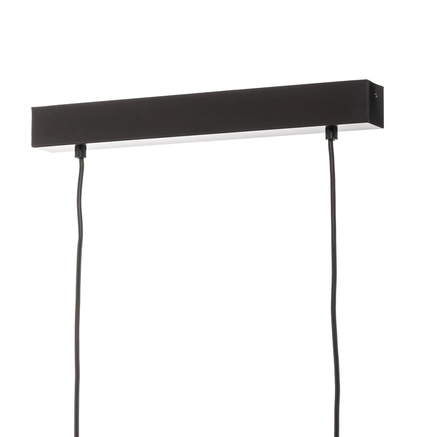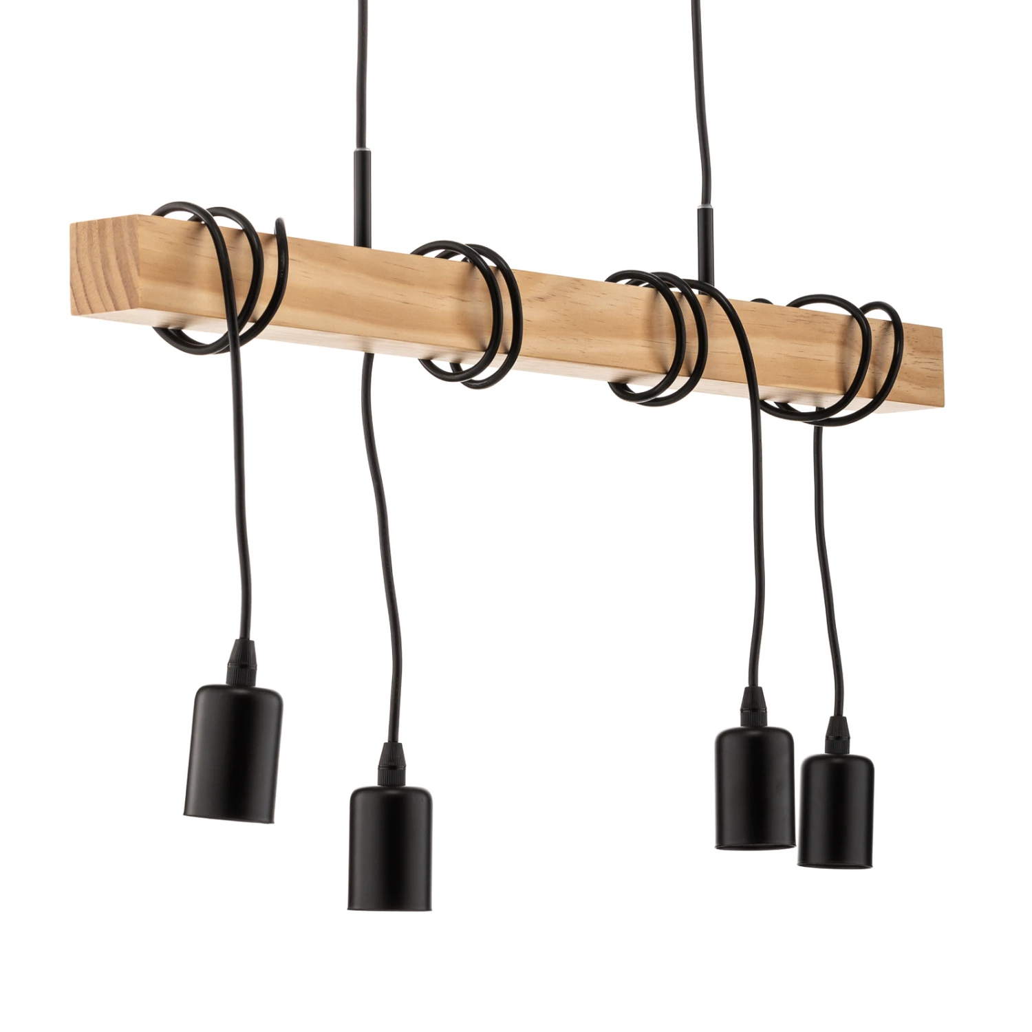The elegant pendant light is mounted on the ceiling with a black canopy. A long wooden beam is attached to the suspension system and has a natural appearance. The cables for the four light bulbs can be wound several times around this base, allowing the bulbs to hang into the room either at one height or at different levels. Therefore, a brilliant light is provided over a dining table, in a hall or elsewhere and provides an optimal illumination of the surrounding furniture.