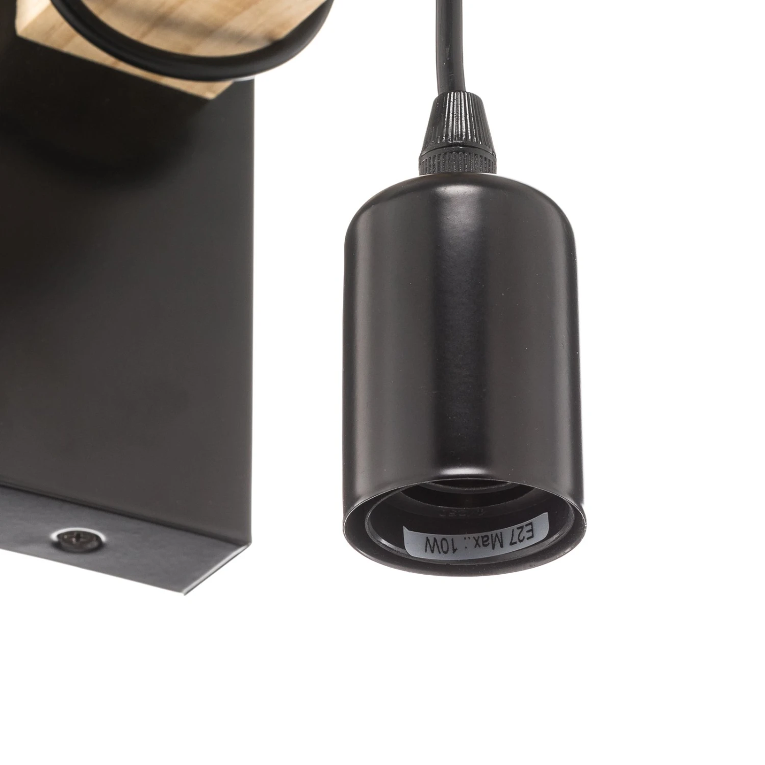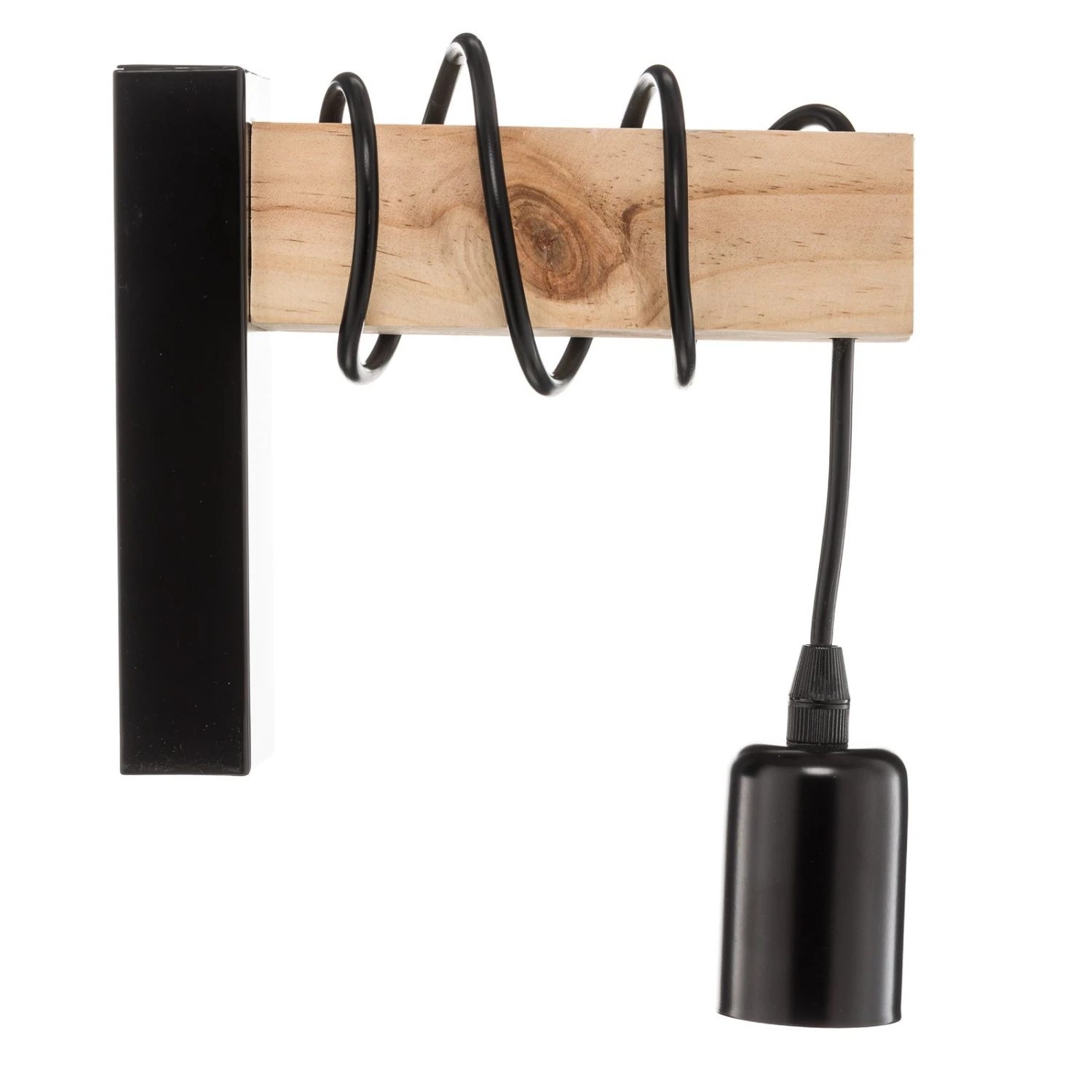 The wall lamp is mounted on the wall via a black mount. A wooden stump protrudes horizontally into the room. A black cable with the light bulb hanging from the end is wrapped around this. Naturalness and an industrial charm are united in the elegant lamp, which fits perfectly into a number of interiors. The light is shown to particularly good advantage as a light source beside a bed.