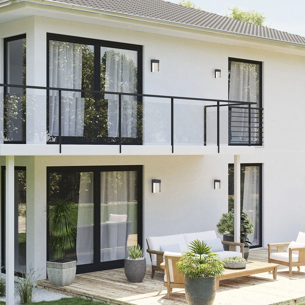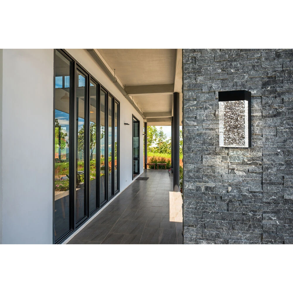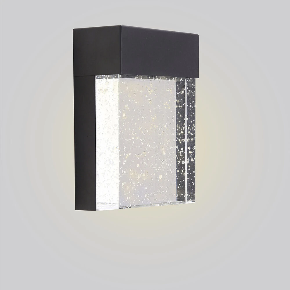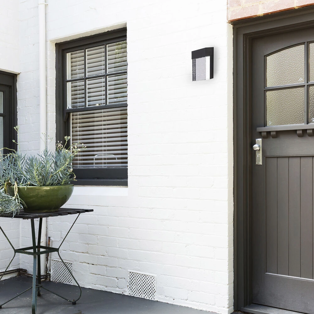 The 7 inch Venecia 1-Light LED outdoor wall light by Eglo is sleek and stylish. Its black matte finish and clear seeded glass offer an elegant look for the outdoors. The integrated LED illuminates from behind the glass which creates an ambient shine. Crafted in stainless steel and glass, this wall sconce is sturdy and long-lasting. The boxy style of the light is complemented by the textural glass element, making this a balanced, distinctive design. This wall light is the perfect bright light for outside the home or garage.