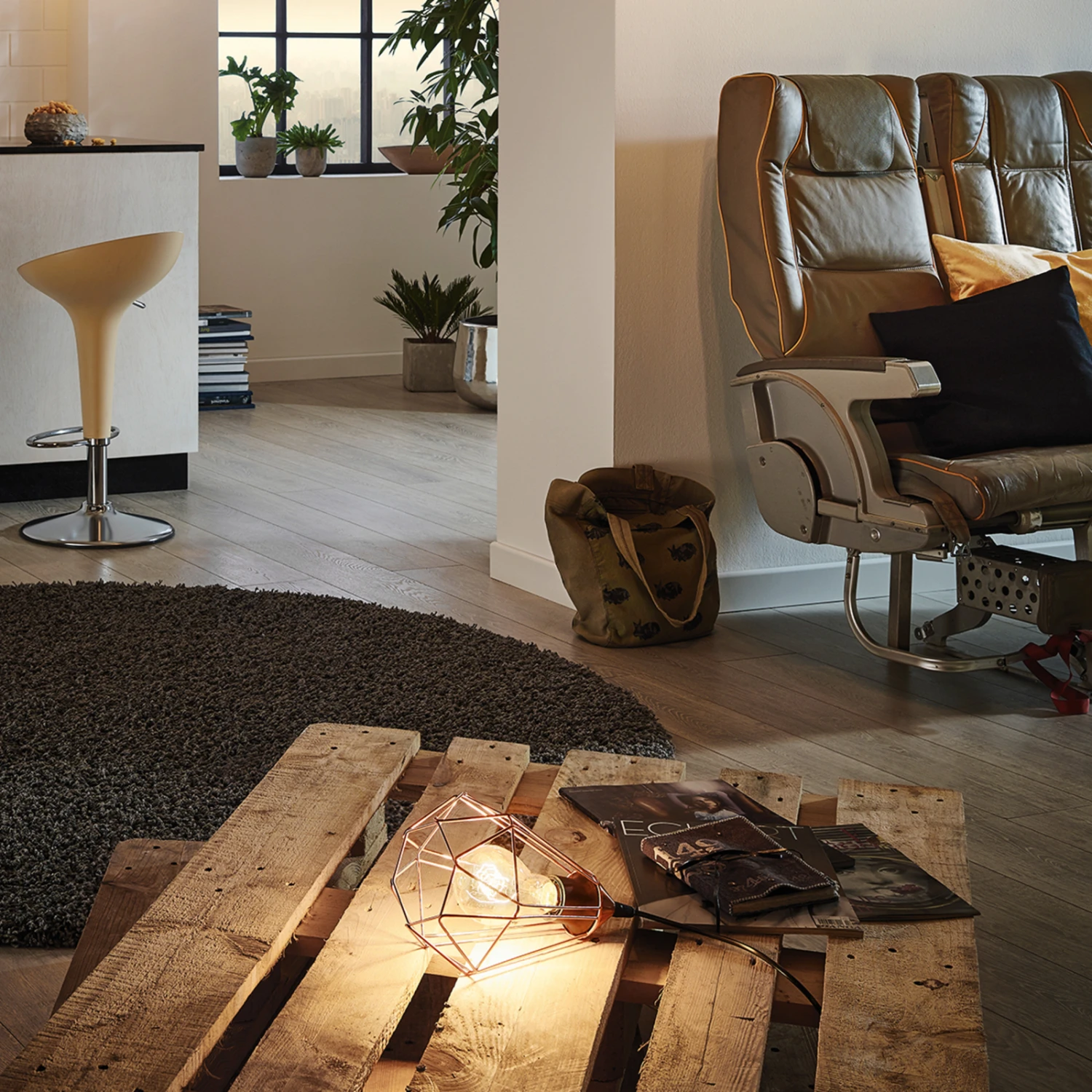 The Tarbes table lamp, which comes in a vintage style, comprises an E27 socket, a black cable with a switch, and a delicately worked metal basket in a diamond shape. The metal basket features a glossy copper finish, which creates a fabulous contrast with the black cable. However, the simple design of the light means that the main focus is on the lamp itself and the light that it emits. Thanks to the metal basket, the light shines into the surrounding area with great effect. The vintage-style globe lamp can be found under “Accessories”.