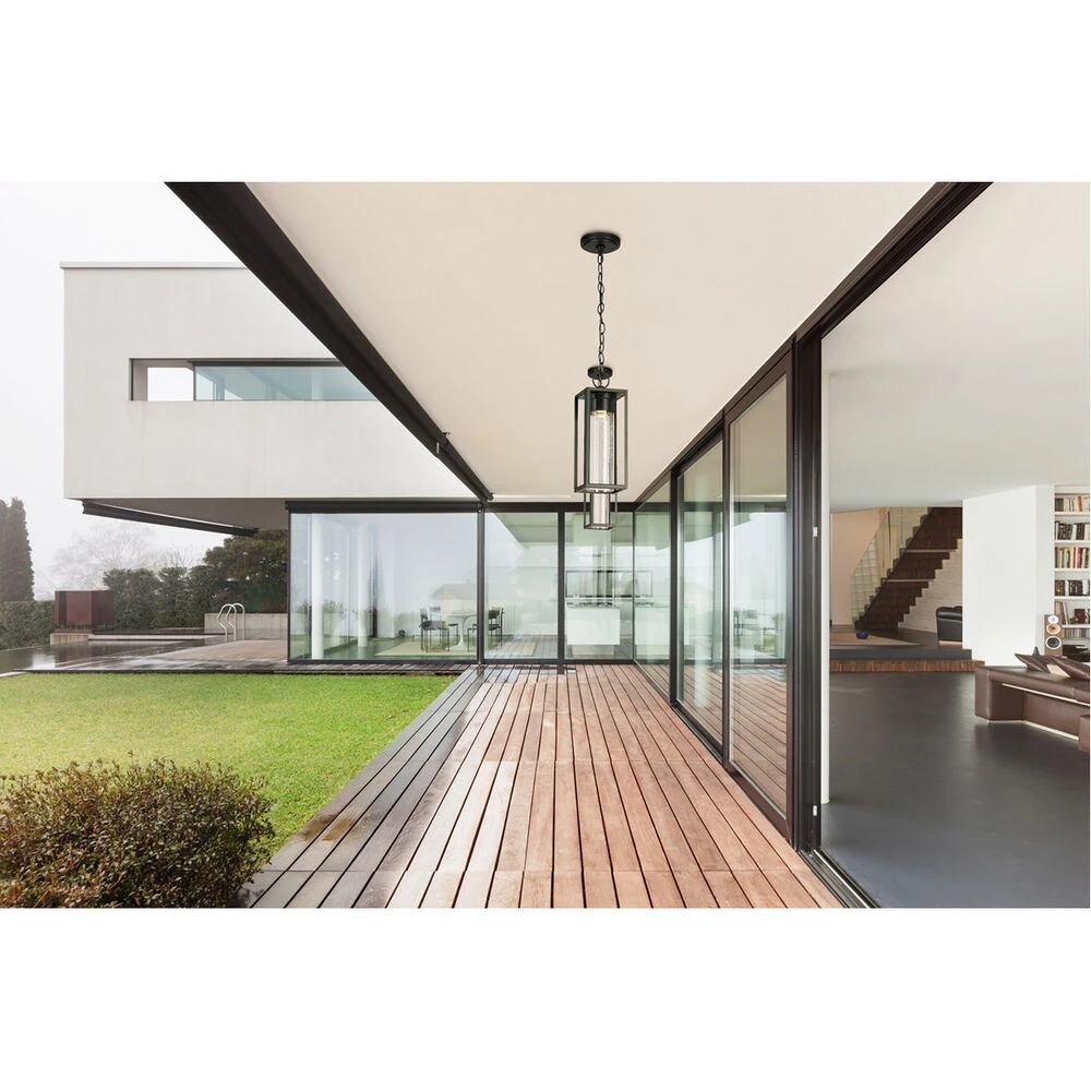 The Walker Hill LED outdoor pendant by Eglo will give your home that new refreshing look you’ve been looking for. A clear seedy glass cylinder suspended within a matte black architectural frame. Beautifully illuminated with LED ambient lighting for a magical appearance of crystallized effervescence